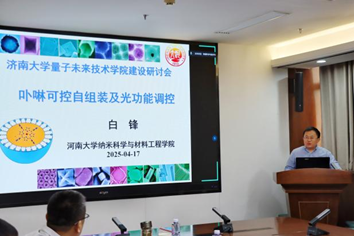 白锋作题为《卟啉可控自组装及光动能调控》的报告,介绍了卟啉在光传输和光催化的作用,特别是对量子传输方面价值。