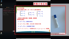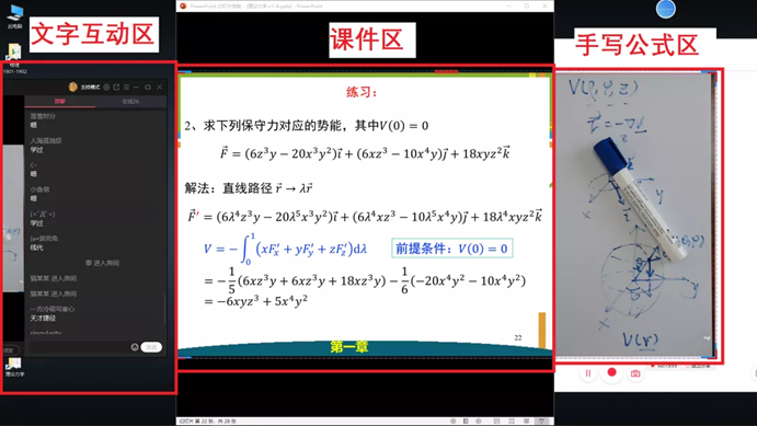 宋玉坤老师教授的是《理论力学》,可能有的同学知道,这门课程是物理学的“四大力学”之一,课程内容涉及非常多的公式推导和解析计算。教室里面对面教授都觉得太难了,听不懂。更何况现在进行的是在线教学,更是马虎不得。若是没有好的在线教学模式,这门课的教学效果会非常差。宋老师在经过多次尝试,最后找到了现在的这种"课件+手写公式“的教学方式。