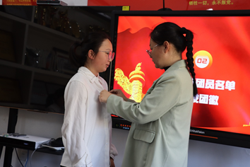 团委书记欧阳阳和老团员代表们一起,逐一为新团员佩戴上团徽,这一刻,新团员们正式成为了共青团大家庭的一员。佩戴团徽不仅是对他们身份的认可,更是对他们未来成长道路上的期许和鞭策。