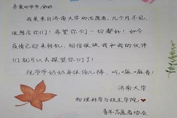 一封封质朴的信件,没有华丽的词藻,也没有夸张的修饰,却字字流露出对老人们关心与挂念,一幅幅动人的绘画作品,展露了同学们对疫情过去后美好生活的期待与憧憬,活动的最后是志愿者们录的视频,视频中充满着对疫情期间无法前去探望的遗憾,提醒老人们平时要多洗手、勤消毒,保护好自己,提高疫情防控意识,并且为老人们送去了最诚挚的祝福。