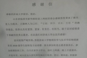 收到一封来自“临清市新华路街上湾街居委会疫情防控指挥部”的感谢信,感谢我校培养出爱国、爱家、有责任、勇于面对疫情、勇于奉献的优秀志愿者,感谢威尼斯娱乐城-威尼斯app
