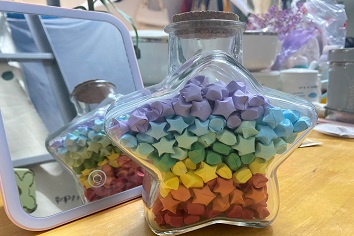 青年志愿者们为给残疾小朋友们献爱心、送祝福,开展了“星星点点,盛满希望”的活动,于5月31日到信望爱残疾人服务中心送上许多装有520颗彩色纸星星的星星瓶。
