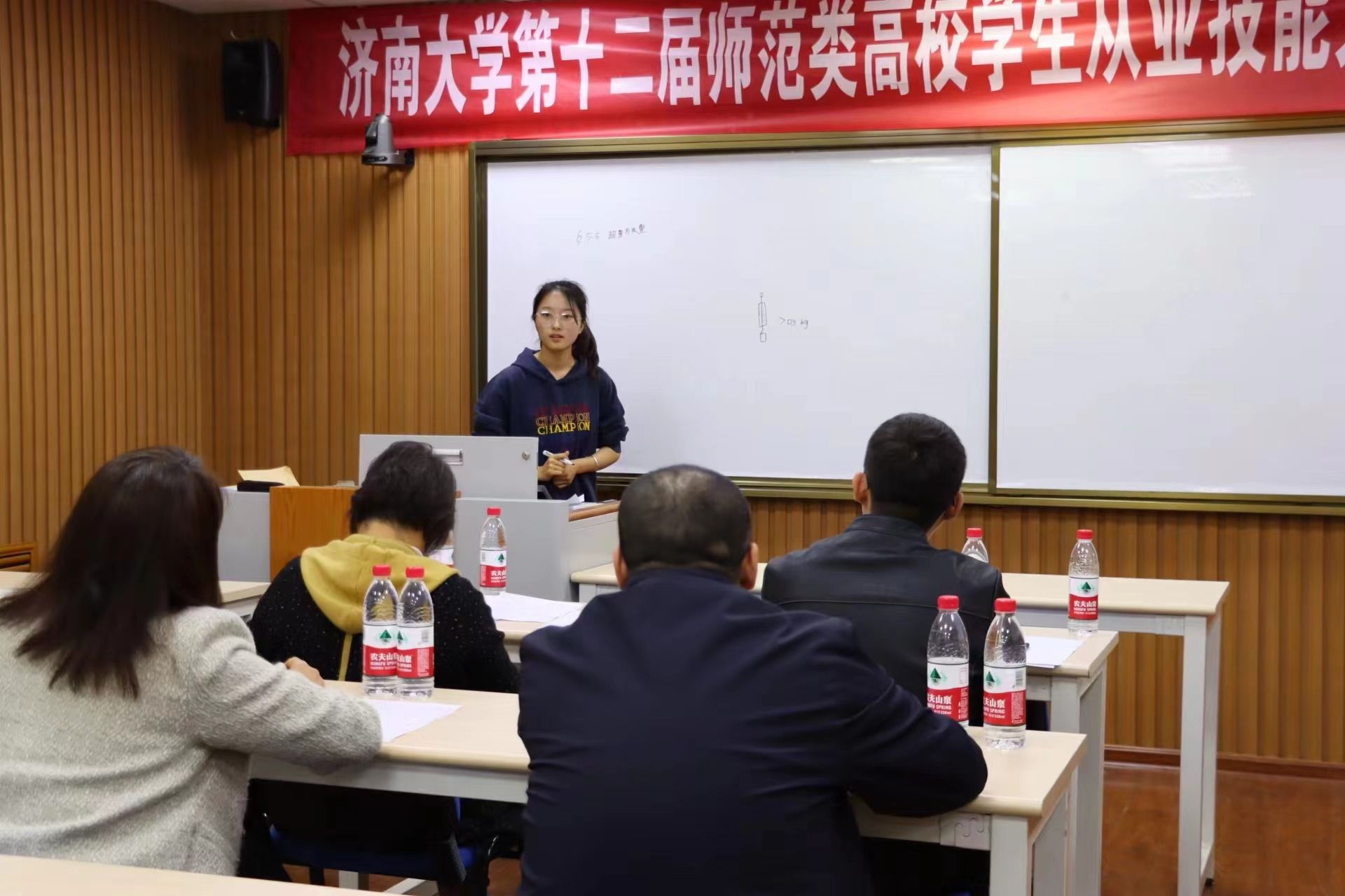 在比赛过程中,选手们随机抽取题目,结合教材进行备课,使用板书进行授课。决赛环节对学生的应变能力、教学基本功的考核要求更为严格。参赛选手借助物理装置图、表格等多种形式,展现了良好的教学风采。在答辩环节,参赛选手思路清晰并沉稳地作答,充分展现了较好的教育理论知识功底和应变能力。比赛结束后,评委老师们就教学仪态与表达、教学方法与手段、教学内容、板书设计、个人特色等方面进行点评和指导,帮助参赛选手分析优势与亮点,找准差距与不足。