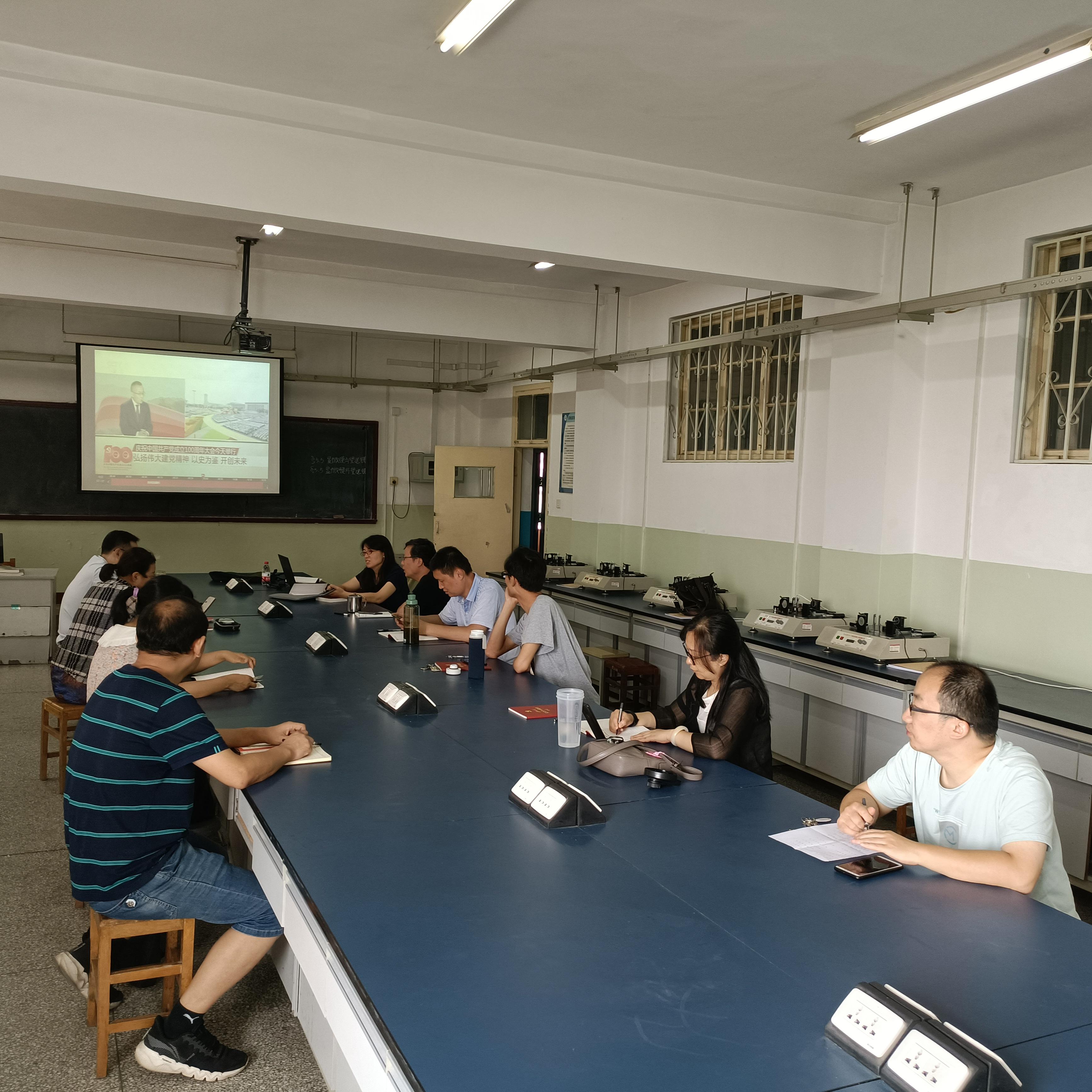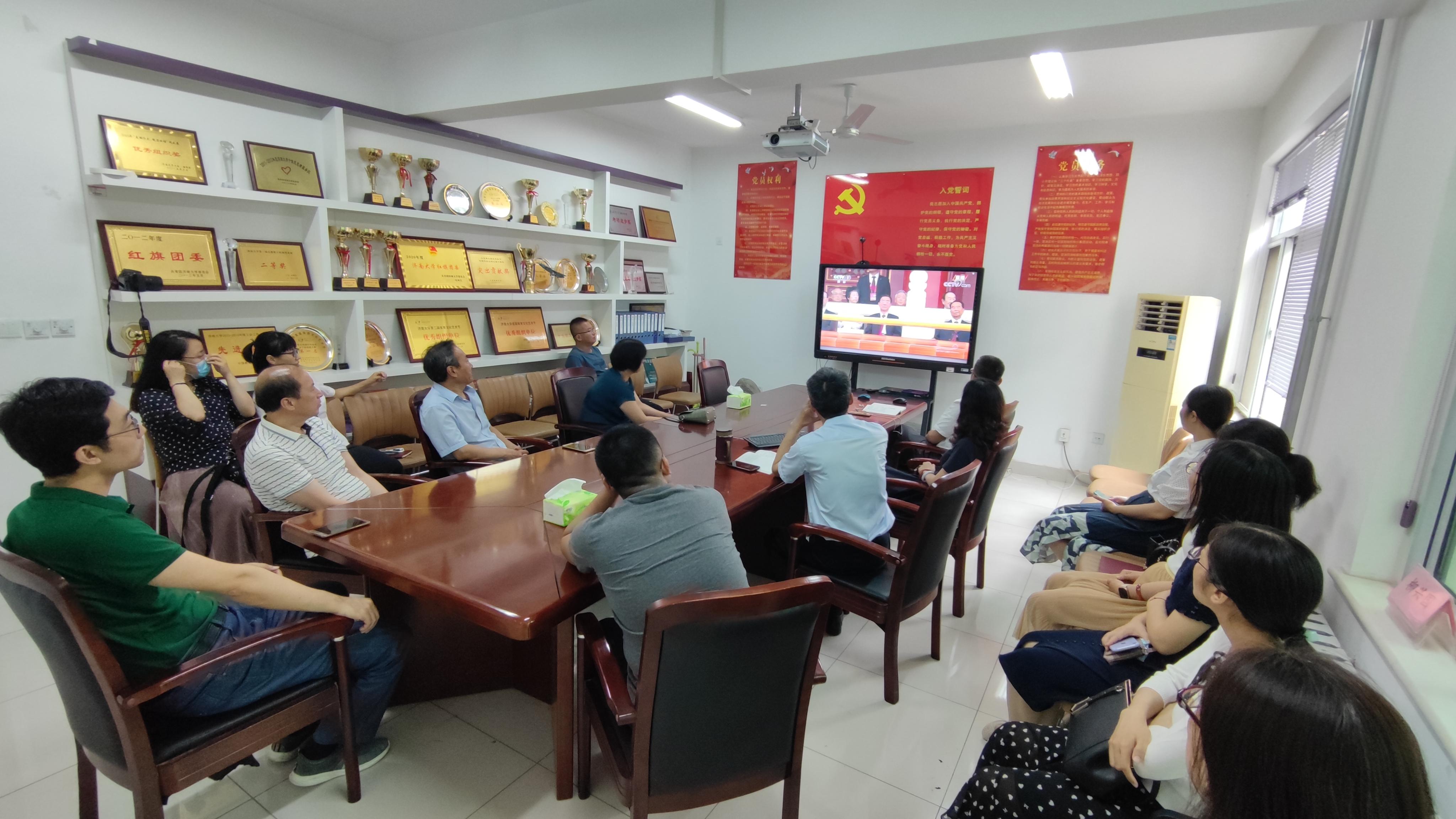 全体师生中国共产党员身穿正装、戴着党徽一同收看大会直播。当天安门广场响起昂扬奋进的国歌时,大家情不自禁地一起高声歌唱,抒发对中国共产党和祖国的热爱与祝福。从筚路蓝缕奠基立业,到创造辉煌开辟未来,大家认真聆听了习近平总书记掷地有声、铿锵有力的重要讲话,欢呼声、鼓掌声不断。大家聚精会神地观看直播盛况,深切地感怀中国共产党100年来的光辉历程和取得的历史性成就、发生的历史性变革。